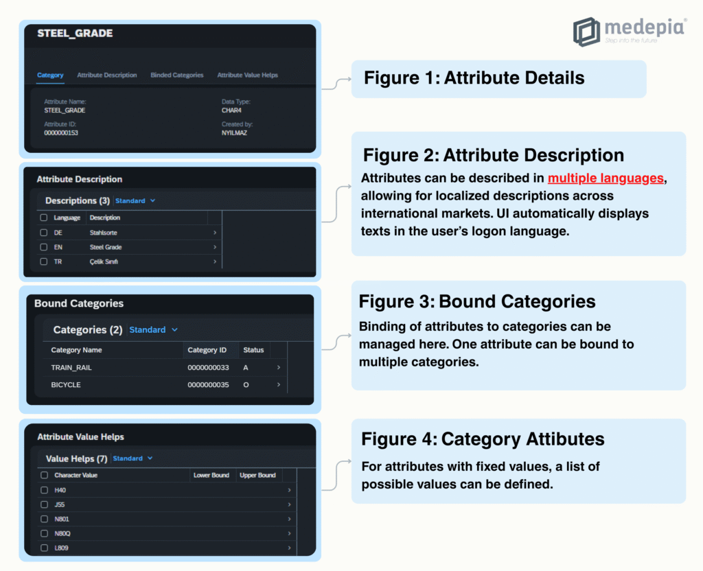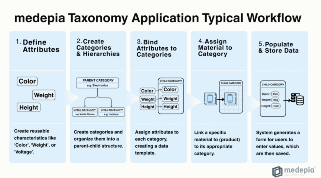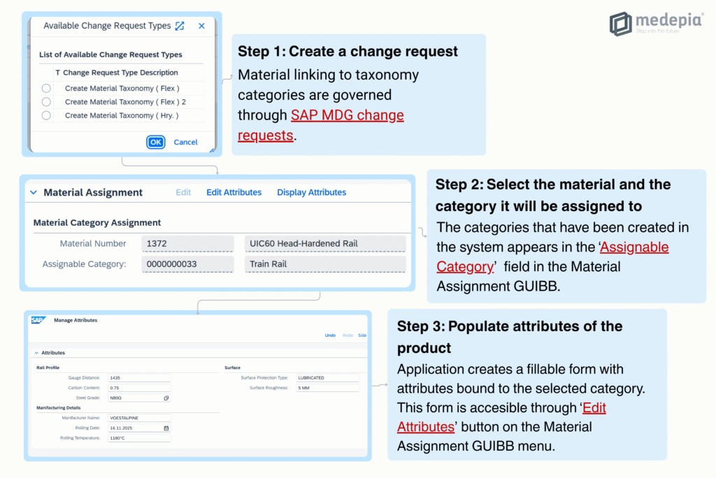 The medepia Taxonomy Application is built around five core processes: creating attributes, creating categories, linking attributes to categories, and assigning materials to these categories while capturing all related product data. Together, these processes form a modular governance framework, allowing product information to be structured, enriched, and maintained consistently across the SAP landscape.