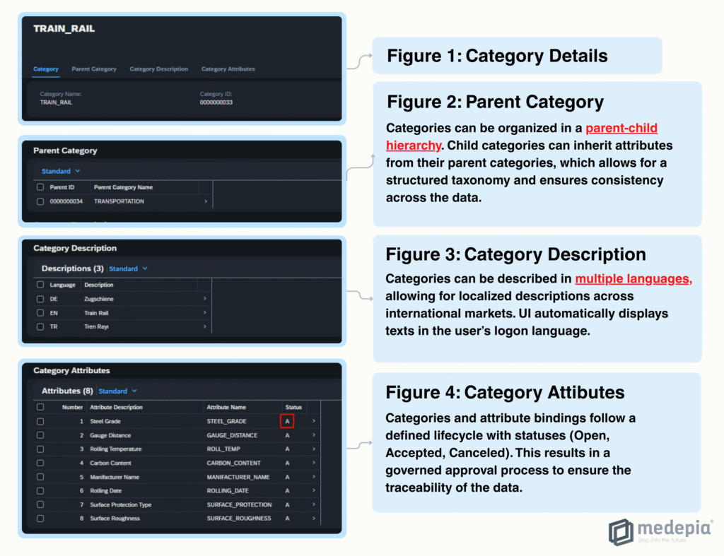 To remain competitive, businesses require a governed, dynamic, and scalable taxonomy application that centralizes the management of product categories and attributes while also ensuring multilingual and hierarchical consistency, integrating seamlessly with SAP’s MDG and RAP environments for robust master data governance. medepia Taxonomy Management directly addresses these needs by providing an easily configurable, unified and intelligent approach to organizing, maintaining, and governing product data within the SAP ecosystem that improves data quality across the enterprise, without any need of backend code or database schema changes.